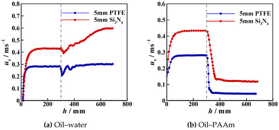 Due to the wall effect slightly influencing the terminal settling velocity, the mean values of different D* are used to calculate Re and Re*. The mean terminal settling velocities were 0.298 m/s (for the PTFE particles in an oil–water stratified fluid), 0.643 m/s (for Si3N4 particles in an oil–water stratified fluid), 0.047 m/s (for PTFE particles in an oil–PAAm stratified fluid), and 0.123 m/s (for Si3N4 particles in an oil–PAAm stratified fluid). Therefore, the Re values for the oil–water stratified fluid were 1678 (for PTFE particles) and 3614 (for Si3N4 particles), respectively, and the Re* values for the oil–PAAm stratified fluid were 1.3 (for PTFE particles) and 5.7 (for Si3N4 particles), respectively.