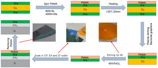 Graphene was grown on copper substrate by the chemical vapor deposition (CVD) method [22]. A wet transfer method using polymethyl methacrylate (PMMA) as a support layer was used to transfer graphene onto a SiNX/Si substrate (made by plasma-enhanced chemical vapor deposition (PECVD)) pre-deposited with metal electrodes [23,24]. The process of graphene being transferred to the specified substrate is presented in Figure 1. After being cropped into 1.5 × 1.5 cm samples, a spin coater was used to apply graphene to copper foil at speeds of 600 rpm/5 s and 4000 rpm/30 s and performed with polymethyl methacrylate (PMMA). PMMA/Graphene/Cu/Graphene samples were placed on a hot plate at 130 °C for 20 min for hot plate hardening to allow PMMA to bind more tightly to the graphene after curing. Next, the samples were treated with O2 plasma to etch the back graphene of the sample, and 40% FeCl3 was used to etch the Cu substrate supporting the graphene for about 6 h. After that, the PMMA/graphene sample was transferred to the target substrate and heated on a hot plate at 85 °C for 30 min. The PMMA layer was dissolved in acetone (CP) solution at 50 °C for 10 min, and then the target was washed with alcohol (EA) solution and deionized (DI) water. Finally, The graphene was patterned by using lithography and O2 plasma etching. The parameters of O2 plasma etching are as follows: power, 60 W; gas flow, 30 sccm; and etching time 3 min.