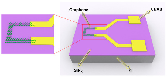 Accurately monitoring temperature with small size has become a critical role not only in life-threatening ailments but also in modern industries with the increasing maturity of micromachining and chip integration technology. Compared with conventional temperature sensors, micro-temperature sensors have attracted research attention because of their miniaturization [1], intelligence [2], and high integration [3,4]. Graphene exhibits excellent properties such as high electron mobility [5], low noise [6], and impressive thermal properties [7,8]. Graphene exhibits the highest thermal conductivity of about 5300 W·m−1·K−1 among the currently known materials [9,10]. Graphene relies on electrons and phonons for heat transfer [11], but the main heat transfer medium is phonons [12]. For this reason, graphene is an ideal material for heat-sensitive elements.