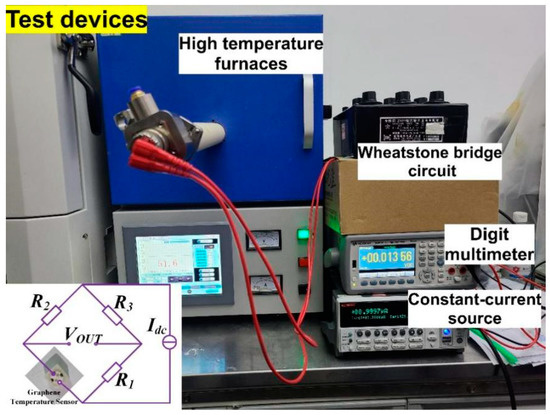 After the graphene temperature sensor device was fabricated, the temperature characteristic of the graphene temperature sensor was tested by using a high-temperature sealed tube and a high-temperature furnace combined with a Wheatstone bridge. Figure 3 shows the test diagram of the temperature sensor, where the sensor was placed in a high-temperature sealed tube in a high-temperature furnace. The test temperature was increased from 300 K to 575 K in 25 K increments and was maintained at each temperature for 10 min to stabilize the temperature inside the furnace. In addition, to mitigate the humidity and gas sensitivity effects of the graphene film, the high-temperature furnace was evacuated and repeatedly cleaned with inert nitrogen gas prior to the measurement to ensure its oxygen-free environment.