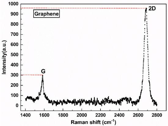 To characterize the number of layers and defects of graphene after transferring, samples were subjected to Raman scattering (HR-800 Horiba Scientific, Inc., Paris, France) [25]. As shown in Figure 4, the G and 2-D peaks are located at 1582 cm−1 and 2700 cm−1, respectively, and the intensity ratio of the 2-D peak to the G peak (I2D/IG) is 3.21, which indicates that the transferred graphene is a monolayer film [26]. No D peak representing defects appeared at 1350 cm−1, which indicated that the graphene film was of high quality [27], and the defects introduced into graphene during the transferring process could be ignored.