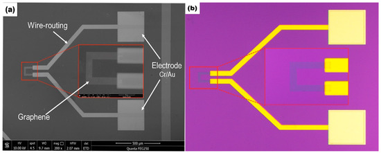 The electrical and thermal conductivity of graphene would be weakened because of the presence of cracks, folds, and organic residues on the graphene surface [28,29,30,31], thus affecting the performance of sensor components. Therefore, to understand the morphology and quality of the graphene surface in the experiment, it was characterized by scanning electron microscopy (Quanta 250, FEI, Inc., Hillsboro, OR, USA) and light microscopy (OM, Axio Scope, Carl Zeiss AG, Oberkochen, Germany). Figure 5a shows the SEM image of the graphene temperature sensor chip, and it can be seen that the transferred graphene surface is smooth and wrinkle-free. Figure 5b shows the chip image of the graphene temperature sensor under the light microscope. From the enlarged area, it can be seen that there is less organic matter residue, no cracks, and a high density of electrode deposition. These results indicated that the transferring quality of graphene films in this experiment was relatively high, and the effect of cracks, folds, and residues on subsequent measurement results could be ignored.