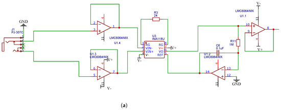 Electrical diagram of the complete EMG acquisition system. (a) The instrumentation amplifier is shown with the operational amplifier in integrating configuration, while in (b), the low-pass and high-pass filters are found. On the other hand, in (c), the notch filter and the offset compensator are exemplified.