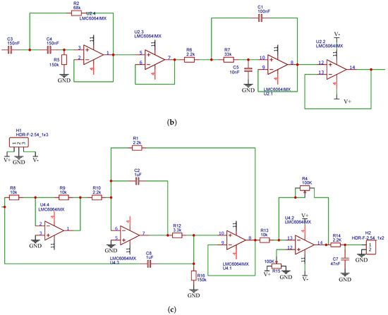 The filtering part was designed using the Filter Design Tool from Texas Instruments and Multisim 14 to simulate the response of the circuits. In this stage, analog filtering was carried out from 10 to 500 Hz, using a low-pass and high-pass filter in series, both second-order Sallen–Key topologies. Finally, a second-order Bainter–Notch notch filter filters the 60 Hz signal from the power supply. The described filters were carried out using the LMC6064 operational amplifier. It should be noted that a buffer amplifier was placed at the input of each of the filters to match impedances between filter stages and avoid signal distortion [26].