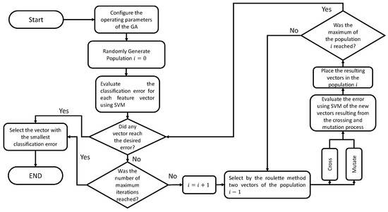 Once the fitness level has been calculated to optimize the task, two chromosomes are selected based on their fitness. The crossover operator is applied to these elements, which produces offspring, in other words, a new feature vector . Once the crossing is over, the mutation operator is applied to the offspring, which establishes a mutation probability to generate , the new offspring is placed in a new population, and the selection, crossing, and mutation process are maintained in an iterative process over the population P until a new population [31] is generated.