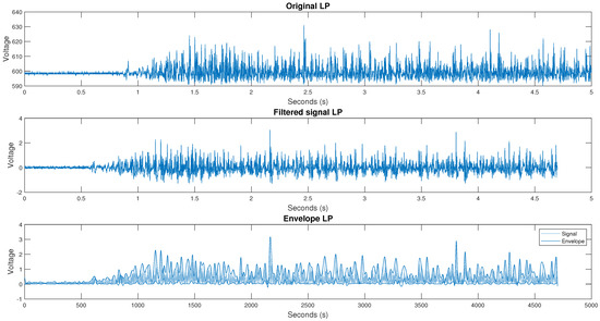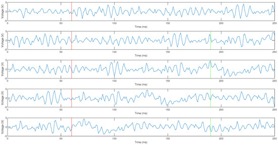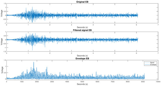 This section describes the filtering and segmentation process of the databases used, the first being from the lower right extremity and the second the database from the upper right extremity. As mentioned above, the first stage after acquiring the signals is to filter them. The filtering was carried out using a fourth-order Butterworth bandpass filter with cutoff frequencies from 10 to 500 Hz. An example of the results of the filtered signals for the base data from the right leg is illustrated in Figure 5. The filtering procedure was repeated for the second database using the fourth-order Butterworth filter with cutoff frequencies of 10 to 500 Hz. Figure 6 shows the result of the right arm filtered signals of the database.