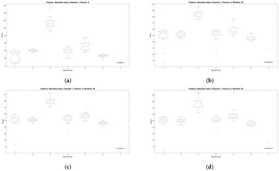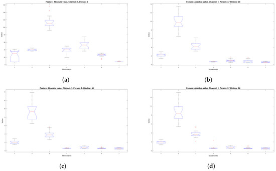 At the beginning of the feature optimization stage, an ANOVA statistical analysis was implemented. Through the box plots, it was verified that the statistical distribution of the data of a complete signal, which has a duration of 5 s, was similar to the distribution of data from the windows, which have a duration of 250 ms, to use the complete signals to select the features that were then used to classify the windows. When all the windows resulting from the segmentation are used, the selection process takes too long, approximately 3 h per iteration of the genetic algorithm. Additionally, ANOVA results were used to remove features that did not present a relevant statistical difference for the right-leg database. On the other hand, the total characteristics for elimination by genetic algorithms for the base of the right arm were entered.