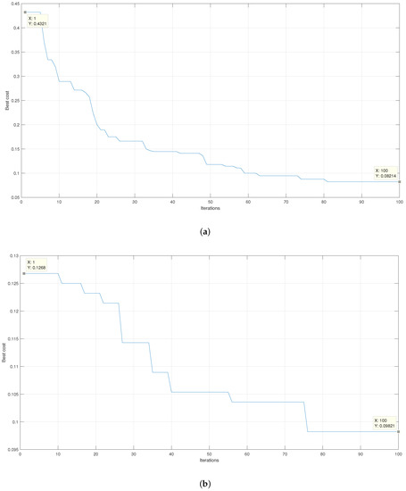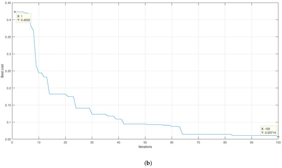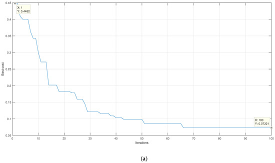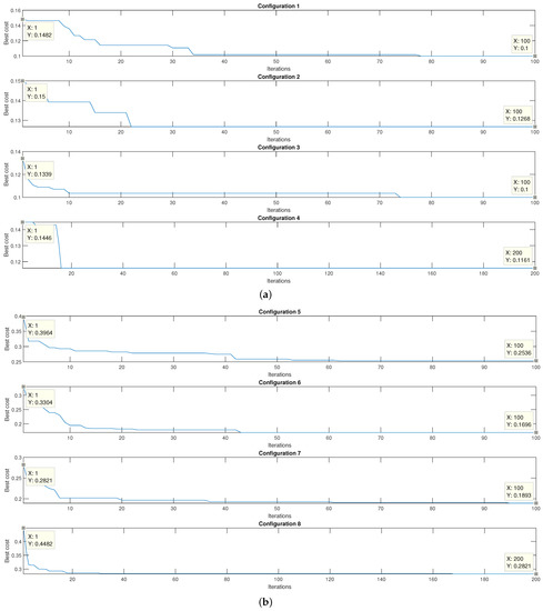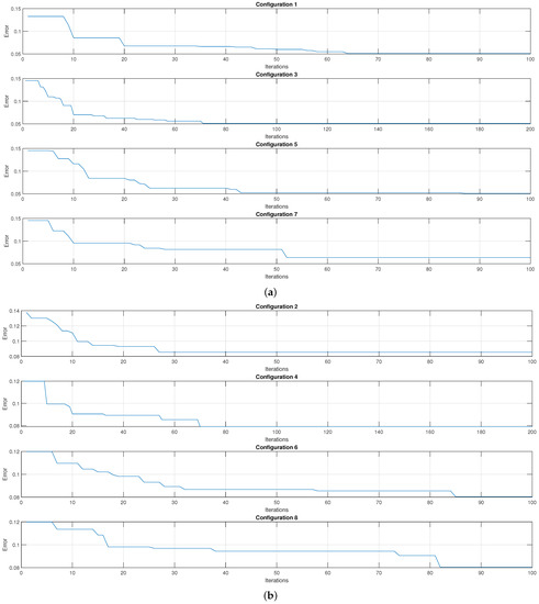 The error values achieved for the various PSO configurations are shown in Figure 15. Figure 15a shows that the average error value reached is 11%. On the other hand, as illustrated in Figure 15b, the average error value reached for the four configurations was 22.3%.