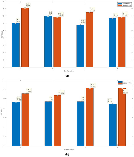Results of the average error percentage for the training and validation of the final SVM with (a) Gaussian kernel and with (b) linear kernel.