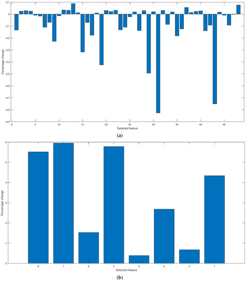Finally, the sensitivity analysis was applied to evaluate the importance of the characteristics selected by PSO and GA. Figure 17a shows the percentage change of the parameters selected by PSO, while Figure 17b illustrates the percentage change of the characteristics given by GA.