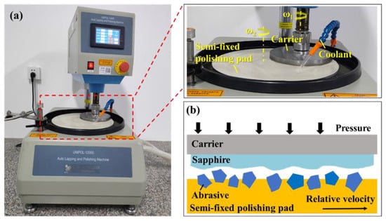 Sapphire, composed of single crystal alumina oxide (α-Al2O3), is an ideal material for infrared windows and aerospace [,] and is the main substrate material for optoelectronic devices, large-scale integrated circuits [,,,], and superconducting films due to its excellent mechanical and optical properties, such as high hardness, strong light transmittance, and stable chemical inertness. In particular, as the substrate material of GaN-based light-emitting diodes (LEDs), sapphire wafers have strict requirements for processing accuracy and surface quality, including nanoscale surface roughness, damage-free, and scratch-free []. However, given the high hardness and chemical inertia of sapphire [,], it’s a great challenge to achieve satisfactory processing results.
