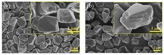FESEM images of pure diamond and diamond/SiO2 composite abrasives are illustrated in Figure 2. The morphology of pure diamond shown in Figure 2a demonstrates that the pristine diamond particles have a uniform shape and smooth surface. As can be seen in Figure 2b, the prepared diamond/SiO2 composite abrasives have good dispersion and no agglomeration. It is also noticed that there are no SiO2 microspheres nucleated separately in Figure 2b, suggesting that the deposition of SiO2 onto the diamond occurred in the form of a SiO2 network rather than SiO2 particles.