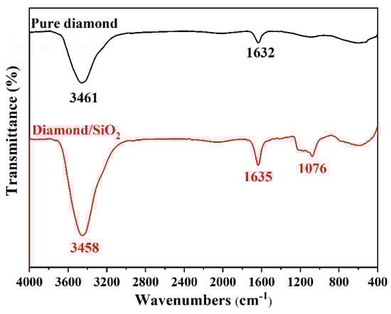 An attempt can be made to research the surface functional groups of abrasives by using FTIR spectroscopy. Figure 4 presents the FT-IR spectra of pure diamond and diamond/SiO2 composite abrasives. For pure diamond, the absorption peaks around 3461 cm−1 and 1632 cm−1 are attributed to O-H stretching and bending vibrations of adsorbed water [], respectively. In contrast, the peak at 1076 cm−1 appears in the spectra of diamond/SiO2 composite abrasives, which is ascribed to the asymmetric stretch vibration of Si-O-Si [], indicating that SiO2 is grafted on the surface of the diamond.