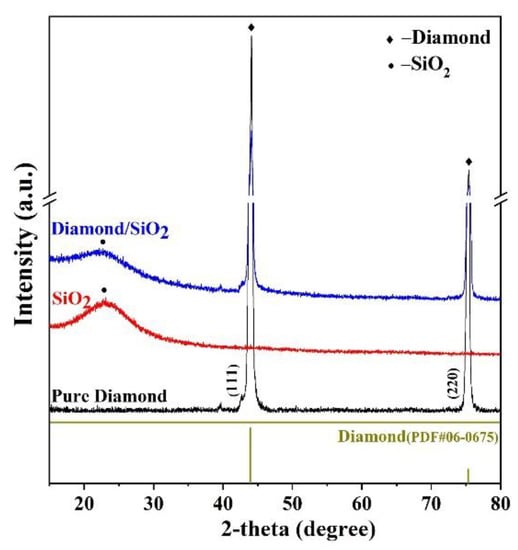 The XRD patterns of pure diamond, amorphous SiO2, and diamond/SiO2 composite abrasives are demonstrated in Figure 5. As we can see, the characteristic diffraction peaks at 2-theta = 43.9° and 75.3° correspond to the (111) and (220) lattice planes [], respectively, which could be indexed as the diamond standard card (PDF#06-0675). The diffraction peak of amorphous SiO2 is a wide and low diffusion peak near 24.3°. The feature peaks of diamond/SiO2 composite abrasives match well with all the diffraction peaks, suggesting that the composite abrasives both contain crystalline diamond and amorphous SiO2, and they have a stable interfacial bonding in core-shell structure, which corresponds to the TEM characterization results. From the above characterization results, it can be seen that diamond/SiO2 core-shell structure composite abrasives were successfully synthesized and that amorphous SiO2 with a thickness of about 10 nm was closely coated on the diamond surface.