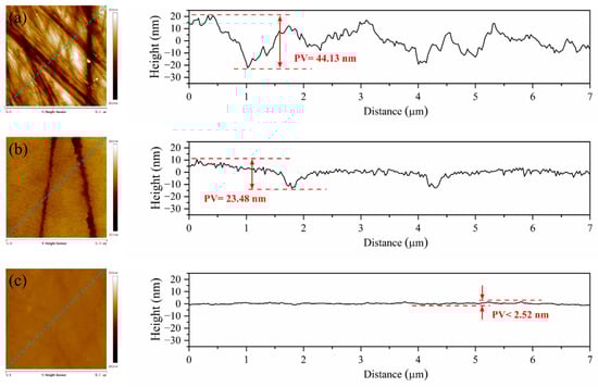 Figure 6 illustrates surface morphology and corresponding profile curves of the sapphire wafers before and after polishing with pure diamond and diamond/SiO2 composite abrasives, respectively. As shown in Figure 6a, the AFM images of pristine sapphire wafers demonstrate poor flatness, rough surface, and numerous scratches, with a maximum scratch depth of more than 22.3 nm, as well as the PV (peak-to-valley) value of 44.13 nm. Figure 6b presents the morphology of the sapphire wafer after polishing with pure diamond. On the whole, the surface flatness has been improved. However, two obvious scratches pass through the sapphire surface, with a depth of 13.1 nm, and the value of PV is 23.48 nm. It could be found that pure diamond abrasives will inevitably bring pits and scratches, which offer limited improvement to the surface quality of sapphire. The morphology of a sapphire wafer after polishing it with diamond/SiO2 composite abrasives is exhibited in Figure 6c, in which all the obvious defects, such as bumps and scratches on the pristine surface, are eliminated. By contrast, the micro profile curve is smooth, and the PV value is the lowest, at 2.52 nm. It can be concluded that the surface morphology of sapphire wafers polished by diamond/SiO2 composite abrasives is superior to that treated by pure diamond, resulting in a smoother and scratch-free surface.
