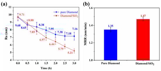 (a) Surface roughness (Ra) and (b) MRR of the sapphire wafer polished with pure diamond and diamond/SiO2 composite abrasives.