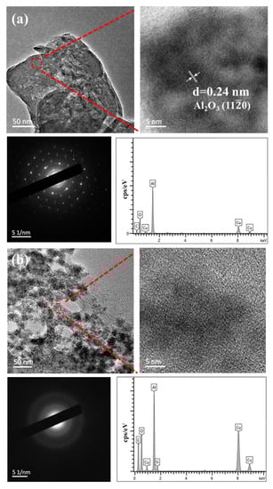 The wear debris, which was removed from the surface of sapphire wafers during polishing, can be used to analyze the polishing mechanism. TEM images, HRTEM images, EDS spectra, and SAED patterns of the wear debris generated by pure diamond and composite abrasives during polishing are presented in Figure 8. The C and Cu elements in the EDS spectra come from the copper mesh plated with carbon support film. As shown in Figure 8a, the wear debris produced by pure diamond is in the form of a block with a size of about 200 nm []. Under HRTEM, lattice stripes can be observed with a spacing of 0.24 nm, which matches the (110) crystal plane of sapphire. Combined with the EDS energy spectrum, it can be preliminarily determined as sapphire wear debris. The corresponding SAED pattern shows regular diffraction points, but polycrystalline concentric rings can also be vaguely observed, demonstrating that the wear debris was most likely both crystalline and amorphous, indicating that the pure diamond abrasives are removed mainly by a single mechanical method in the polishing process. Figure 8b illustrates the wear debris generated by diamond/SiO2 composite abrasives, and that debris is in the shape of fragments, showing the size of dozens of nanometers. Under the detection area shown in the figure, the HRTEM image has no lattice fringes, and the SEAD pattern presents a large diffuse halo, indicating that the wear debris is amorphous. Furthermore, the EDS spectrum contains not only Al and O elements but also an Si element. It can be inferred that the SiO2 shell reacts with sapphire in the process of polishing to form a new amorphous Al2O3-SiO2 compound, which means that the material removal process combines chemical corrosion and mechanical action [].