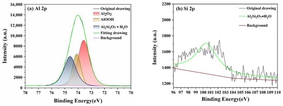XPS was used to characterize the composition and existing form of elements in the sample, which can confirm the chemical corrosion mechanism in the polishing process. Figure 9 demonstrates the XPS spectra of the Al and Si elements on the sapphire wafer surface polished by diamond/SiO2 composite abrasives. According to the narrow scanning spectrum of Al 2p shown in Figure 9a, there are three main chemical states of Al on the surface of sapphire. The peak, centered at 73.57 eV, corresponds to Al2O3, which is the main component of sapphire wafer, and peaks at 74.10 eV and 74.60 eV can be assigned to AlOOH and Al2Si2O7⋅H2O [], respectively. From Figure 9b, the peak of Si 2p with the binding energy of 100.43 eV could be attributed to Al2Si2O7⋅H2O []. This observation indicates that the SiO2 shell of composite abrasives underwent a solid-state chemical reaction with the surface of sapphire, which yields AlOOH with a Mohs hardness of 3–3.5 and Al2Si2O7⋅H2O with a Mohs hardness of 4. Possible reactions can be summarized as follows: