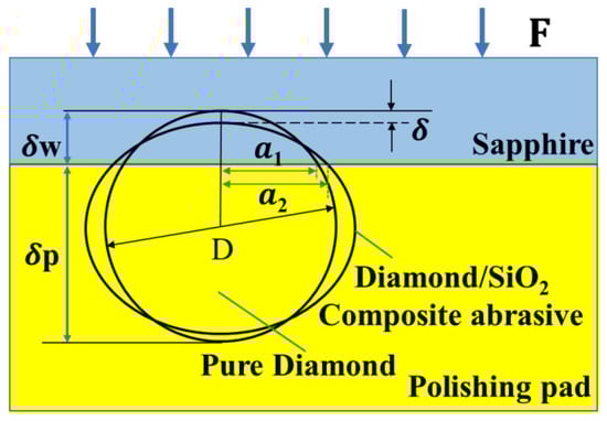 where is the polishing pressure, is the deformation of the particle; is the diameter of the particle; is the Young’s modulus of the particle and wafer pair; and are the Young’s modulus and the Poisson’s ratio of the abrasive particle, respectively; and are the Young’s modulus and the Poisson’s ratio of the wafer, respectively; is the Young’s modulus of the particle and pad pair; is the indentation depth of the particle into the polishing pad; and is the indentation depth of the particle into the sapphire wafer [].