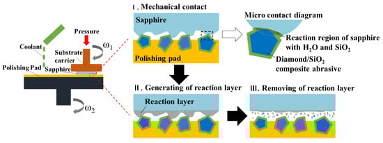 In fact, when the diamond/SiO2 composite abrasives are used in the polishing process of sapphire, the larger elastic deformation also obtains a larger contact area with the sapphire wafer, such that the solid-state reaction can proceed more continuously and fully []. Subsequently, the softening reaction products can be easily removed by the mechanical action of abrasives, which is more significant than the plow effect, thus further improving the MRR. Therefore, only by relying on the chemical corrosion and mechanical action of composite abrasives to balance and promote each other is it possible to at the same time improve the surface roughness and the MRR. Figure 11 shows the material removal model of diamond/SiO2 composite abrasives for polishing sapphire wafers.