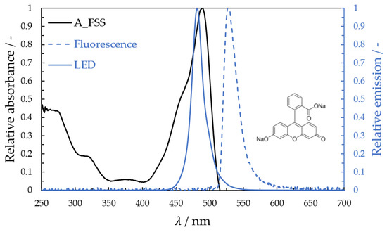 The fluorescein sodium salt is commonly used due to its absorption and emission in the visible range. Disadvantages of fluorescein are its low fluorescence lifetime, pH sensitivity, and tendency to decompose in the presence of oxygen. The fluorescent indicator fluorescein sodium salt (C20H10Na2O5) (FSS, M = 376.27 g/mol, Merck KGaA, Darmstadt, Germany) is a red-orange crystalline powder. It is well soluble in ethyl alcohol, water, and glycerol and is very suitable for many applications and experiments because of its easy handling (no health hazard). The indicator can be excited in both spectral regions, ultraviolet (UV) and visible (VIS). In the UV range, fluorescein has a high absorption between 250 and 350 nm, and in the VIS range, it has a higher absorption peak at about 490 to 492 nm. The emitted spectrum is between 500 and 695 nm, with a maximum emission peak at about 530 nm [91]. Absorption and emission spectra of the dissolved fluorescein sodium salt were measured with a UV/VIS spectrometer (light source: CLD600, sensor module: MCS601, Carl Zeiss Spectroscopy GmbH, Jena, Germany) (see Figure 2). The light source (470 nm) used for the fluorescence measurement is also shown.