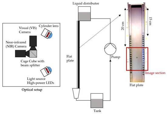The stainless steel plate has a width of 5.2 cm, a length of 40 cm, and is made of steel grade 1.4541. The same material was used for the calibration cuvette. The surfaces of both steel components were treated with a glass bead blasting of grain size 40 to 70 μm, resulting in a rough, diffuse surface that prevents direct reflections. The cameras are placed perpendicular to the falling film plate. The distance between the falling film and the camera is 36 cm, and between the illumination unit and the falling film, it is 17.3 cm. The same distance to the calibration cuvette was configured for the calibration procedure. Markings for the imaging analysis are placed on the edge of the plate, see Figure 3.