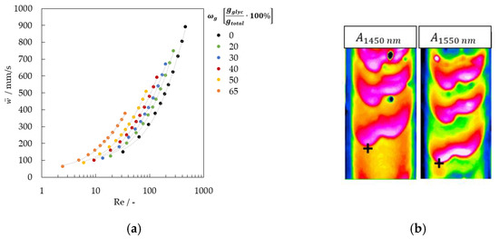 Parameters such as the mass flow rate m ˙ , the kinematic viscosity ν , the density ρ , and the plate width of falling film B F determine the Reynolds number, see Equation (2). The pump worked with a volume flow rate between 150 and 1450 mL/min in the experiments.