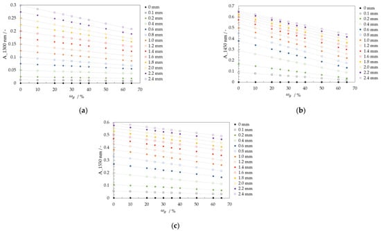 The partial identification of a substance and quantitative analysis of samples in the near-infrared range is possible by knowing the absorbance curve over the wavelength. The absorbance calculation, which represents the attenuation of light after it has passed through a substance, is carried out using the Beer-Lambert law, see Equation (1). It describes the relationship between the absorbance A λ and the concentration c, the film thickness d, and the molar absorbance coefficient ε λ . The absorbance is defined as the decade logarithm of the ratio of irradiated light intensity I 0 and transmitted light intensity I [95].