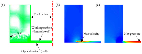 (a) FEA mesh model and the (b) velocity and (c) pressure distributions (gap = 0.25 mm, amplitude = 30 μm).