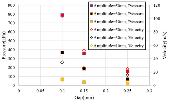 The simulation results showed that the liquid velocity caused by ultrasonic vibration reached the maximum at the edge of the gap, as shown in Figure 2b. The pressure in the gap changed periodically with the ultrasonic vibration and was roughly distributed in a Gaussian shape. The maximum velocity at the edge of the gap and the maximum pressure inside the gap decreased exponentially with the increase in the gap and showed a rapidly decreasing trend with the decrease in the amplitude, as shown in Figure 3.