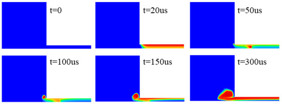 The variation in cavitation clouds generated by ultrasonic vibration with time was represented by the variation in vapor fraction shown in Figure 4. It can be seen from this figure that under the high-frequency impact of the polishing liquid, the cavitation zone first appeared near the working surface of the horn, the cavitation bubbles overflowed at the edge of the gap in the radial direction, and the overflowing cavitation bubbles moved away from the workpiece surface. When moving away from the surface of the workpiece, the overflowing cavitation bubbles dissolved or disappeared after some time and eventually reached equilibrium.