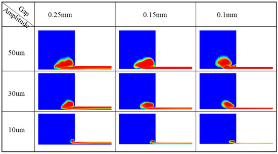 Figure 5 shows the variation trend of cavitation intensity and cavitation distribution with respect to the gap and amplitude. It can be seen from this figure that increasing the amplitude significantly improved the cavitation rate, while increasing the gap had little effect on the cavitation rate. When the gap was large, if the cavitation rate was not enough, the cavitation cloud gathered near the working face and could not fully exert the erosion processing on the workpiece.