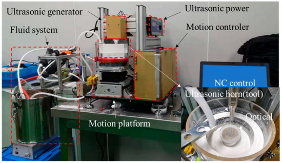 To improve the polishing efficiency, many researchers combine ultrasonic processing technology with the existing polishing technology by applying ultrasonic vibrations to the polishing tool, workpiece, or polishing fluid. For example, Zhang studied a rotary polishing tool head applied vertically to the surface of BK7 optical glass with the aid of axial ultrasonic vibration (UVAP). The experimental results show that this method can improve both the material removal rate (MRR) and surface quality [15,16]. Suzuki developed a two-axis ultrasonic vibration polishing tool to obtain more complex polishing trajectories. Experiments showed that applying ultrasonic vibration to a polishing tool allows for obtaining a surface roughness Rz of 8 nm [17]. In abrasive waterjet machining, Lv adhered a workpiece to an ultrasonic horn and the workpiece was ultrasonically vibrated by the horn. The experimental results show that the introduction of ultrasound can improve the material removal efficiency by 82% [18,19]. Beaucamp studied the method of applying ultrasonic motion inside a jet nozzle to improve the removal rate of fluid jet polishing and the material removal rate was increased by 380%. The research results of ultrasonic-assisted jet polishing show that the jet fluctuation caused by ultrasonic vibration is the main factor that improves the MRR. As the ultrasonic cavitation zone is far away from the workpiece surface, the cavitation bubbles disappear before reaching the workpiece surface, and thus, the microjets caused by the explosion of the cavitation bubbles did not affect the material removal [20,21].