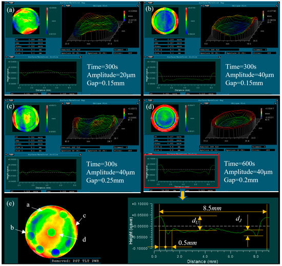 Removal pit profiles after using the ultrasonic tool: (a) removal pit under the processing parameters of time = 300 s, amplitude = 20 μm, and gap = 0.15 mm; (b) removal pit under the processing parameters of time = 300 s, amplitude = 40 μm, and gap = 0.15 mm; (c) removal pit under the processing parameters of time = 300 s, amplitude = 40 μm, and gap = 0.25 mm; (d) removal pit under the processing parameters of time = 60 s, amplitude = 4 μm, and gap = 0.2 mm; and (e) the lens’s overall surface shape error distribution after the experimental processing.