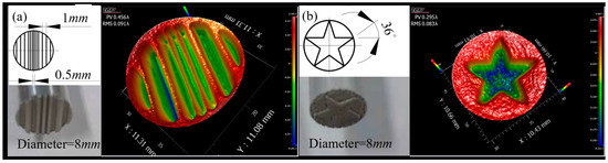 Figure 8 shows the material removal distribution formed by different geometric structures on the working surface of ultrasonic vibration tools. It can be seen from Figure 8a that interference formed when the spacing of the geometric structures was less than 0.5 mm. It did not matter whether the structure was inside or at the edge of the ultrasonic vibrating surface. This further indicated that the material removal caused by fluid scouring was small. It can be seen from Figure 8b that the corresponding removal distribution at the apex of the five-pointed star became an excessive arc, where the radius of the arc was about 0.25 mm. It can be known from the above experimental results that this processing method produced an edge effect of 0.25 mm. Therefore, if the geometric structure of the tool’s working surface is larger than 0.5 mm, the structure can be copied to the workpiece surface using this method.
