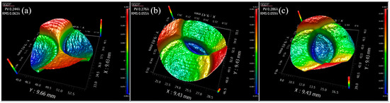 The measurement results clearly showed that the distribution of the removed material was like a tool head shape (round). Figure 7e shows the lens’s overall surface shape error distribution after processing. By analyzing the shape changes in the bottom surface of the removal pits and the pit’s position on the lens, it was found that the initial surface shape of the lens was retained. This showed that the changing trend in the overall surface shape at the pits was consistent with the changing trend at the bottom of the pits, which meant that the material removal in the tool processing surface was uniformly distributed. There was a groove on the edge of the removal pit, which can be seen clearly in Figure 7b,d, and the groove depth (dJ) increased with the increase in removal depth (dU), as seen by comparing the cross-sectional profile. The ratio of dJ and dU changed under different process parameters. For example, the ratio of dJ and dU in Figure 7b was clearly larger than in Figure 7d. The width of the groove was about 0.5 mm. The center of the removal area was slightly raised, which can be seen clearly in Figure 7c. The diameters of removal pits under different process parameters were basically the same at about 8.5 mm, which was 0.5 mm larger than the tool diameter.