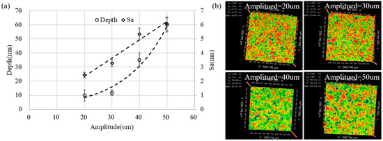 Figure 10a shows that the removal depth increased exponentially and the surface roughness increased linearly with the increase in amplitude. It can be known from the above analysis that as the amplitude increased, the cavitation density and cavitation intensity also increased, which meant that more and stronger cavitation bubbles participated in the material removal, increasing the removal rate. Figure 10b shows that the surface morphology exhibited more obvious discreteness and randomness compared with the surface formed by small tool head polishing or jet polishing [36]. As the amplitude increased from 20 μm to 40 μm, the removal uniformity became significantly worse and it appears that the red area representing the convex peaks on the figure became smaller and more dispersed. This was because the blasting energy of the cavitation bubbles increased, thereby increasing the removal depth. Furthermore, after the amplitude increased to 50 μm, the red area blocks on the figure became significantly larger. This was because the peaks formed on the surface became slenderer as the amplitude increased and the polishing fluid flow velocity in the gap increased, resulting in the removal of the microstructure peaks.
