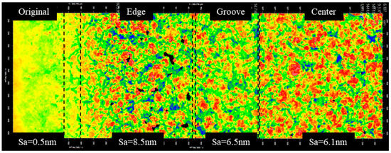 Figure 11 shows that the surface roughness at the machining edge was larger than the center area and had more obvious dispersion. The surface microstructure at the edge groove significantly reduced the dispersion and surface roughness. According to the research results of Section 2, it can be known that the pressure fluctuation at the machining edge was smaller than that of the machining center, the blast density of cavitation bubbles was reduced, and a more favorable growth into larger bubbles with greater bursting power occurred. Therefore, the removal uniformity was poor and the surface roughness was higher at the edge. The flow velocity at the groove was large and the scour of the polishing fluid played a certain role in reducing the surface roughness. The roughnesses in the central area and the grooves were not much different, but the area in red was larger in the figure, which indicated better removal uniformity. This was due to the higher density of cavitation bubbles bursting in the central region under high pressure fluctuations, but the bursting energy of individual bubbles was reduced.