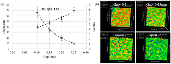 The influence of the gap on the removal pit: (a) the depth and the bottom surface roughness and (b) the bottom surface morphology (time = 300 s, amplitude = 40 μm).