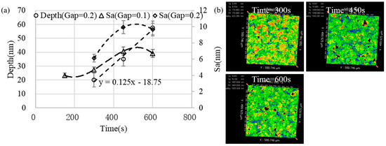 Figure 13 shows that the removal depth increased linearly with the increase in processing time. The growth rate of the surface roughness became slower with the increase in time, and the larger the gap, the larger the roughness value. It can also be seen from Figure 13b that as the processing time increased, the number and area of the red regions representing the micro-convex peaks decreased (compare time = 300 s and time = 450 s); the blue area representing the lowest point was also decreasing (compare time = 450 s and time = 600 s). This was because the initial surface roughness of the sample used was very low (Sa = 0.5 nm) and the initial surface was not completely removed in the early stage of processing, and thus, the roughness gradually increased. When the newly machined surface formed and the density of effective cavitation bubbles had stabilized, the roughness stabilized.
