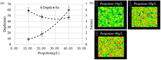 As can be seen from Figure 14a, as the particle concentration increased, the depth of the removal increased exponentially with a slight decrease in the surface roughness. From the microstructure shown in Figure 14b, the area of the blue region representing the pit was larger at lower concentrations, which indicated that the removal uniformity in the microscopic range was poor. When the concentration increased, the red area representing the convex peak on the microscopic surface increased, which indicated that the scouring removal effect was significantly enhanced. Previous research showed that the presence of particles in liquids can cause bubbles to burst more easily [33]. Therefore, as the particle concentration increased, the burst concentration of cavitation bubbles increased, which contributed to the improvement of removal uniformity.