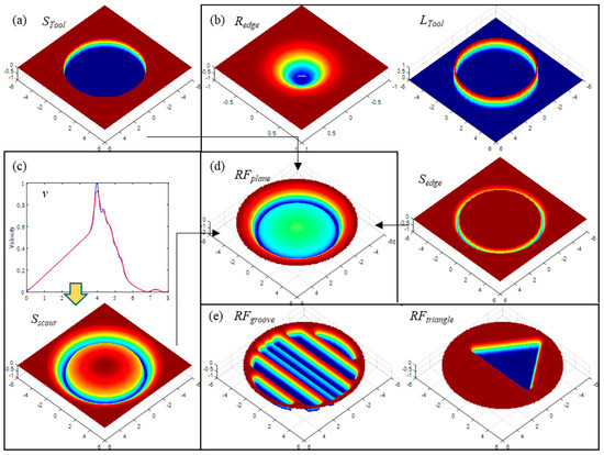 Removal distributions model: (a) the shape of the tool’s working surface, (b) the edge removal distribution model, (c) the fluid scouring removal model, (d) the plane tool’s removal function, and (e) the tool’s removal function with complex working surfaces.