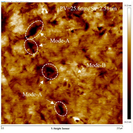 According to Figure 16, within the detection range of 2 μm × 2 μm, the diameter dA of the mode-A pit was about 100–200 nm, the depth hA was between 14 and 24 nm, and the number M was about 4. The length of the long side lB1 of the mode-B pit was about 100 nm, the length of the short side lB2 was about 10 nm, the depth hB was between 14 and 24 nm, and the number N was about 400. The evolution process of the surface generated by the combined action of mode-A pits and mode-B pits is shown in Figure 17.