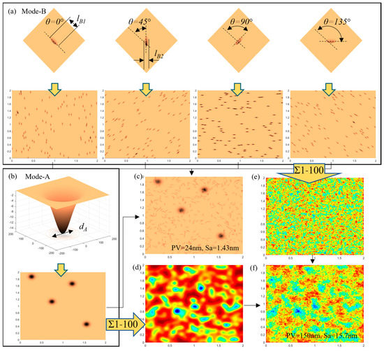 Removal pit shape and formed surface morphology in different modes: (a) four directions of mode-B removal pit and a random distribution, (b) mode-A removal pit and a random, distribution, (c) surface morphology using mode-A and mode-B per unit of time, (d) surface morphology using mode-A after 100 units of time, (e) surface morphology using mode-B after 100 units of time, and (f) surface morphology using mode-A and mode-B after 100 units of time.