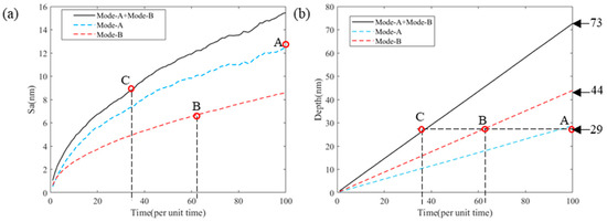 Figure 18b shows that the removal depth increased linearly with time. The removal depth of mode-A and mode-B processing together equalled the depth when using each processing mode alone. Under the parameter settings listed in Table 3, the material removal rate ratio of mode-A and mode-B was 28:44. The point A, B, and C represent the processing time of different methods for the same removal depth, corresponding to the points with the same name in Figure 18a. The points A, B, and C in Figure 18 show that when the same depth of material was removed, the roughness of the surface formed by mode-A was the largest and the roughness of the surface formed by mode-B was the smallest.