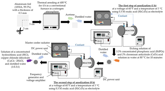 AAO nanoporous membranes were fabricated using the two-step anodization process (Figure 2). A high-purity annealed aluminum foil (1050A, 99.5%) with a thickness of 0.5 mm was used for experiments. At first, aluminum foil was cut into 5 cm × 5 cm square specimens, which were annealed at 400 °C for 4 h under nitrogen ambient. Annealing was carried out in a conventional furnace. Then, the specimens were degreased in acetone and rinsed with distilled water. The prepared specimens were anodized in the electrochemical reactor. Anodization was performed at a voltage of 60 V and a temperature of 5 °C using 0.3 M oxalic acid (H2C2O4) as the electrolyte. The first anodization step lasted 1 h. Then, the synthesized oxide layer was chemically etched in a mixture of 3.5% concentrated phosphoric acid (H3PO4) and 2% chromium anhydride (CrO3) acid solution in water at 80 °C for 10 min. After being washed with distilled water, the specimens were placed in an electrochemical reactor, where the second step of anodization at 60 V and 5 °C temperature for 8 h was performed. Then, the aluminum layer from the AAO membrane was removed using a solution of a concentrated hydrochloric acid (HCl), copper chloride dihydrate (CuCl2 × 2H2O), and distilled water (1:0.3:1). Finally, the specimens were rinsed with distilled water and air-dried.