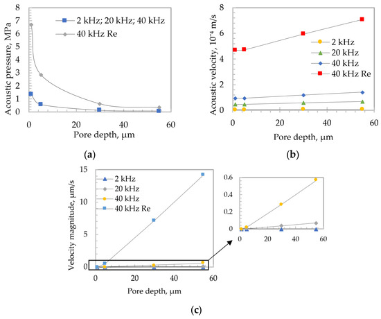 The acoustic pressure decreased (Figure 3a) in all cases as the pore deepened. The highest acoustic pressure values were obtained at the resonant high-frequency excitation of 40 kHz. When evaluating the acoustic velocity (Figure 3b), the obtained results showed that the velocity slightly increased with the depth of the pore. The maximum value of the acoustic velocity was obtained at the resonant frequency of 40 kHz. When evaluating the velocity magnitude (Figure 3c), the maximum average values of the fluid flow velocity were also obtained at the resonant frequency of 40 kHz.