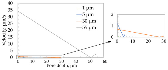When evaluating the velocity dependence along the length of the pore, the velocity decreased uniformly as the pore deepened. In all the cases, close to the bottom of the pore, the velocity values decreased to zero and started to rise steadily until the fluid flow approached the bottom of the pore. At the point at which the flow velocity was zero, a barrier zone of unmixed flow appeared. At a depth of 1 µm, there was no unmixed barrier fluid flow, so the electrolyte could be intensively refreshed all the time. At a resonant frequency of 40 kHz, the velocity contours of fluid flow at different pore depths are presented in Figure 5.