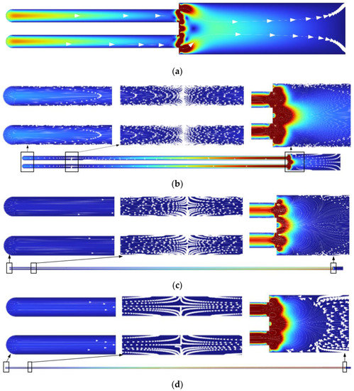 Moreover, looking at today’s technologies and their development, miniaturization is an integral “economic driver” of today [23,24,25,26,27], and research related to micro- and nanosized elements is relevant in areas such as mini-LEDs and OLEDs [28], solar cells [29,30], electrotherapy and drug delivery [31], sensors [32], etc. The growing potential of these technologies encourages the study of microchannels, which differ from conventional channels in their channel diameter [33,34,35,36]. Since flow regimes in small fluid volumes are often laminar, fluid heat exchange is limited, and it is likely that the fluid temperature increases along the length of the microchannel [37]. Therefore, to achieve an efficient and rapid fluid flow mixing process in straight microchannels, acoustofluidic physics has gained much interest in recent decades [38,39]. Surface acoustic waves (SAW) apply the effects of ultrasonic waves and have received a lot of attention from researchers due to their noninvasive nature and the advantages of efficient fluidic control [40]. Researchers have shown that mixing efficiency of the hot and cold fluid laminar flows can be improved by using acoustic streaming [41].