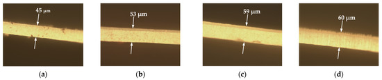 Using frequencies of 20 kHz and 40 kHz and the resonance frequency of 40 kHz, the pore diameters of the fabricated membrane were obtained. Respectively, they were 103 ± 10 nm, 105 ± 10 nm, and 105 ± 10 nm. Consequently, the interpore distances were 140 ± 10 nm, 140 ± 10 nm, and 145 ± 10 nm, and the thicknesses were 53 ± 0.5 µm, 59 ± 0.5 µm, and 60 ± 0.5 µm. It can be concluded that the pore diameter and the interpore distance remained unchanged under different anodization conditions. However, the thickness of the AAO membrane increased by 17.8% at 20 kHz. Furthermore, the thickness increased by 31.1% at 40 kHz and 33.3% at the resonant frequency of 40 kHz. The thickness of the AAO membrane was also measured using a microscope (Nikon Eclipse lv150, Tokyo, Japan). Images of the thickness of the AAO membrane are shown in Figure 6.